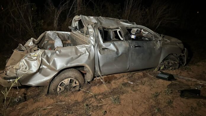 Quatro pessoas, sendo 3 mulheres e um homem, ficaram feridas após uma Hilux capotar, no final da tarde de quarta-feira (03), na Estrada do Manso, em Chapada dos Guimarães. Foram encontradas garrafas de whisky, cerveja e energético no local. Um homem, que também estava no carro, não foi encontrado.