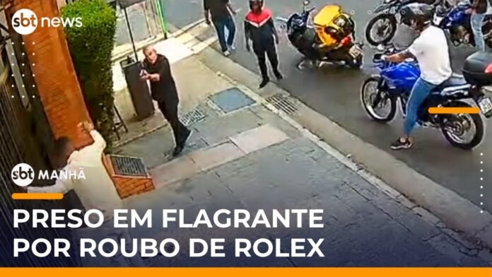 A Polícia Civil prendeu Edison da Silva Júnior, de 34 anos, suspeito de roubar um relógio Rolex na região dos Jardins, área nobre de São Paulo. Câmeras registraram o momento da prisão: a primeira pessoa a agir foi um segurança de um condomínio, que conteve o ladrão até a chegada da polícia. O suspeito foi rendido por policiais e estava com o relógio, um celular e um revólver. A vítima relatou que foi abordada enquanto caminhava com a esposa. Edison tem antecedentes por roubo, tráfico e associação para o tráfico.