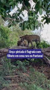 Uma onça-pintada foi registrada desfilando ao lado de seu filhote em uma cena rara e fofa em Poconé, município de Mato Grosso. A onça caminha sobre galhos de árvore enquanto o filhote a acompanha de perto, em meio à vegetação da região, mostrando a riqueza da fauna presente no Pantanal mato-grossense.