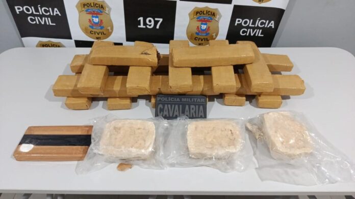 Os policiais rapidamente cercaram o veículo e realizaram a abordagem. No interior do carro estavam dois homens e um forte odor de maconha. Na busca veicular, foi encontrada dentro do porta-malas uma caixa com 19 barras de maconha e 3 quilos de cocaína.